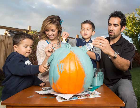 The Hess family of Spanish Springs applies teal-colored paint to a pumpkin for the Teal Pumpkin Project, which offers non-food treats at Halloween for children with food allergies. From left are Preston, 3; mother Erin Hess; Tyson, 6; and father Aaron Hess.