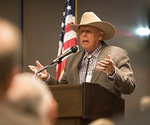 Both Bundy and his wife, Carol, reminded listeners of the incident in April 2014 on the Bundy Ranch, when the BLM seized nearly 400 of Bundy’s cattle for grazing on federal land for years and were then met with armed protesters from Bundy’s family and others. After he was arrested in 2016, Bundy spent 700 days in prison before a federal judge in Las Vegas dismissed charges against him and two of his sons last month.