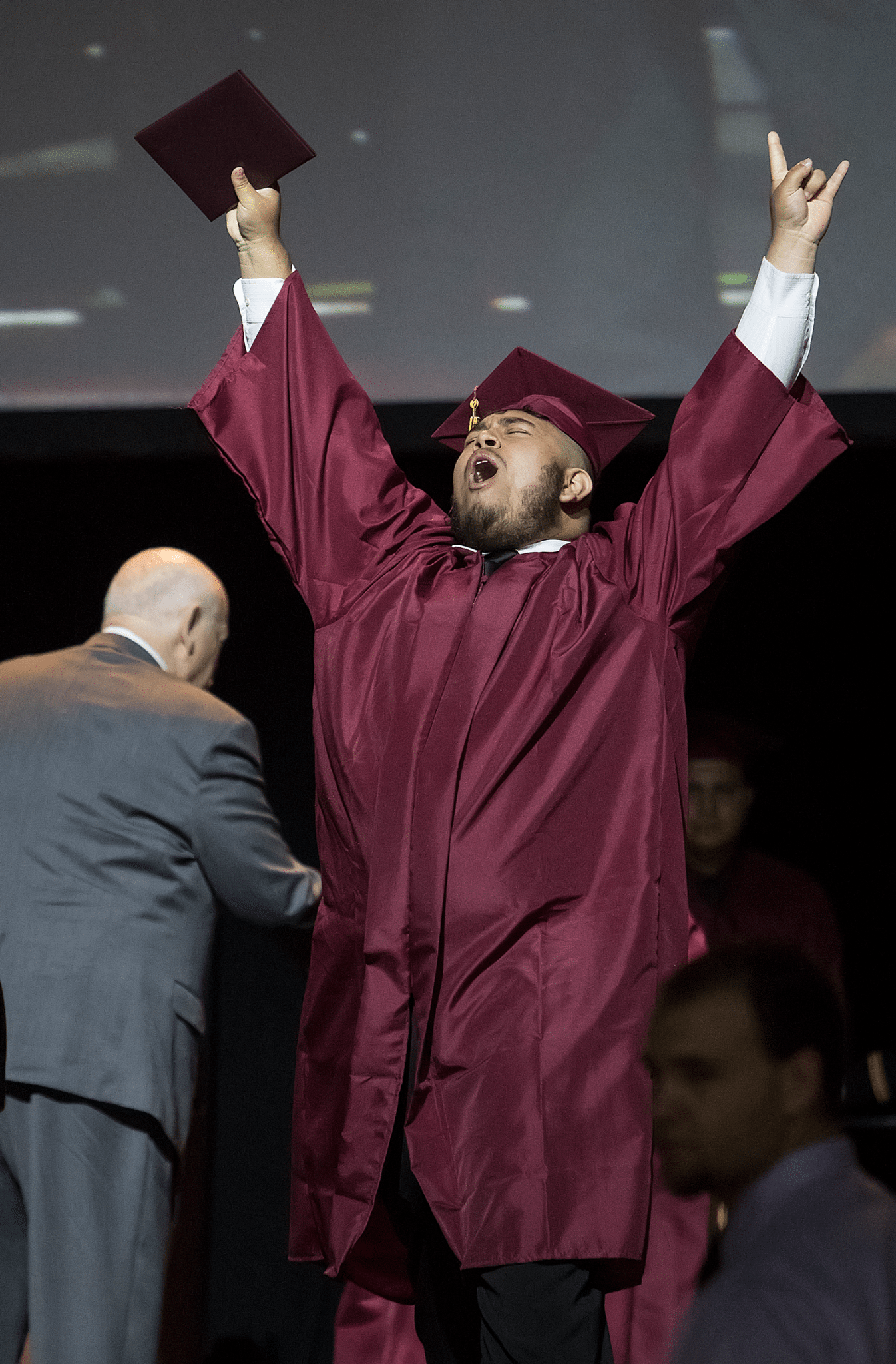 Sparks High School Principal Kevin Carroll congratulates a student at the Class of 2018 graduation ceremony last week. Carroll said the class finished near the goal of the 90 percent graduation rate that they set before the year began and was proud of their accomplishments. “This was an awesome class, the students were well behaved and took care of business,” Carroll said.