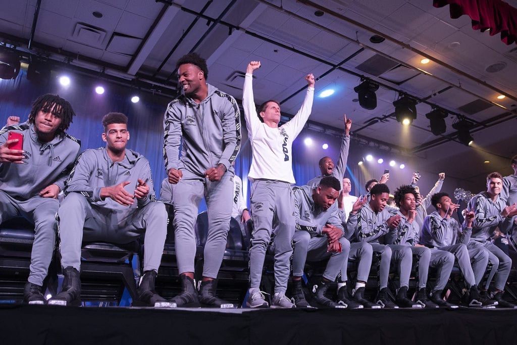 The Nevada basketball team reacts after hearing its name called on Selection Sunday at the Silver Legacy in Reno.