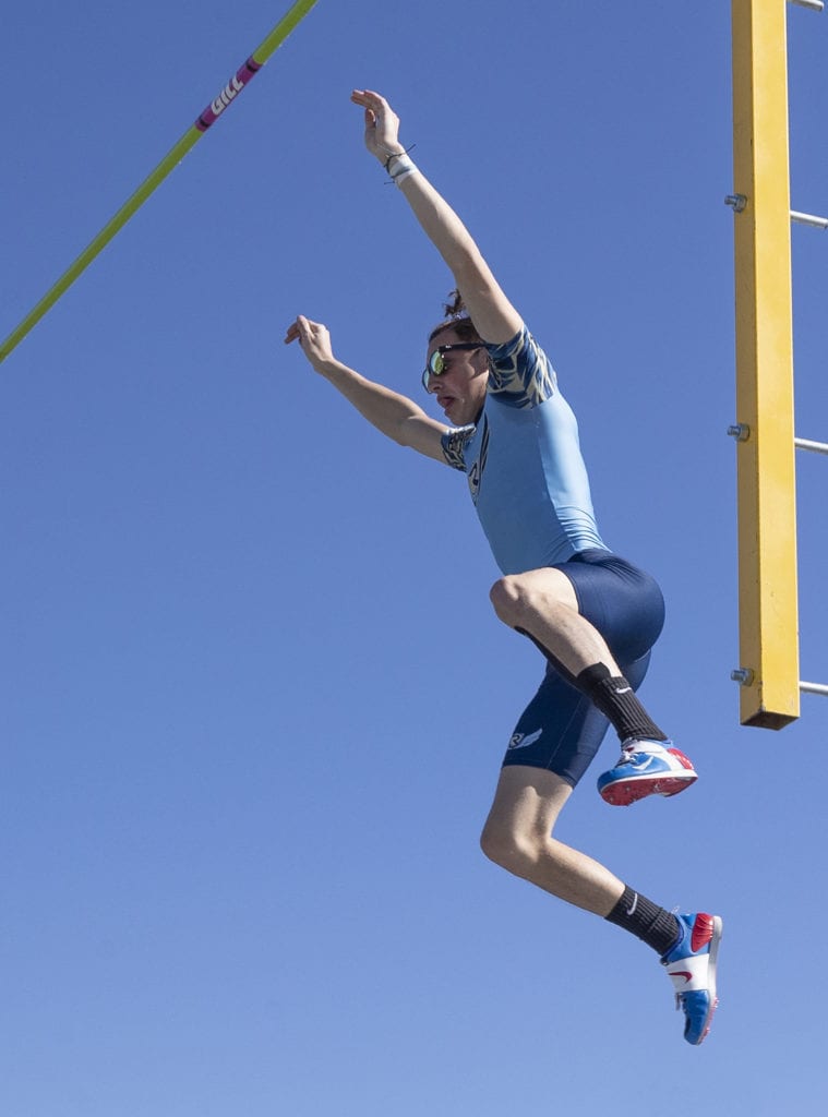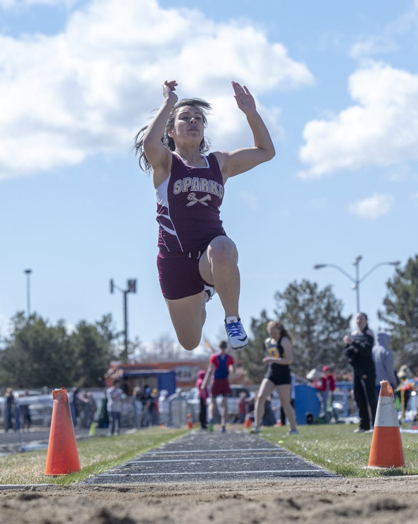 Spanish Springs junior Maggie Poulsen competes in the girls 100 meter hurdles at the annual Reed Sparks Rotary Track Meet Saturday. Poulsen finished seventh in the event with a time of 17.32.Reed’s Alden Cocanour won the varsity pole vault competition with an effort of 14’00. Sparks High School junior Cristal Villatoro competes in the varsity long jump event at Reed Saturday. Villatoro set a personal record with a jump of 13’7.