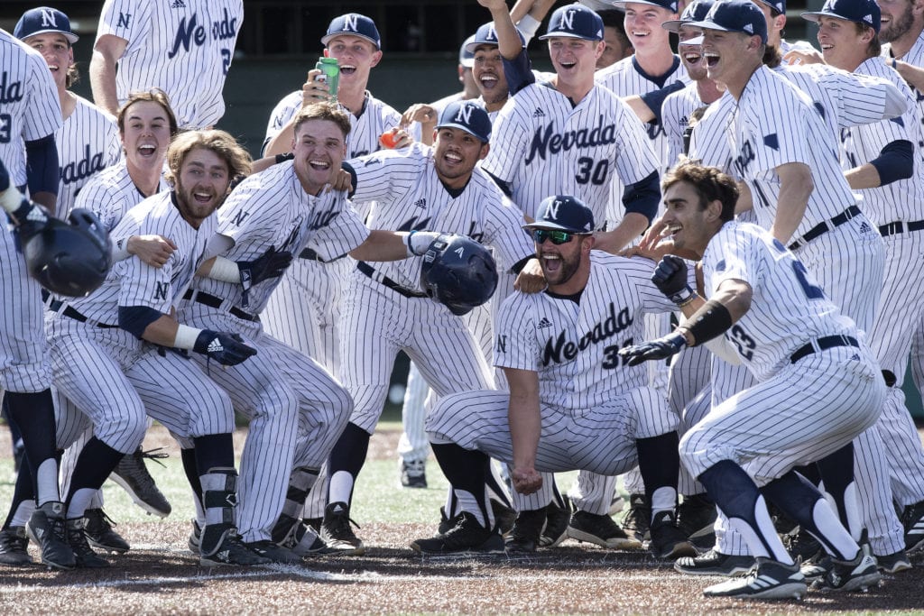 Wolf Pack baseball players wait for Keaton Smith to cross the plate after the senior hit a 10th inning walk-off home run against No. 2 Oregon State last Tuesday at home.