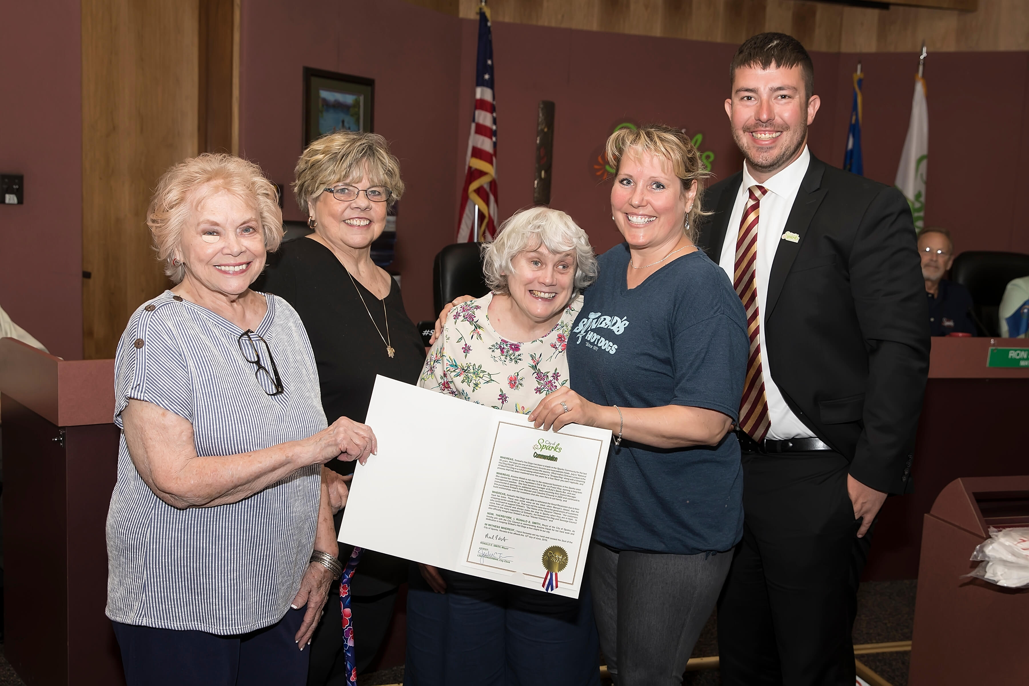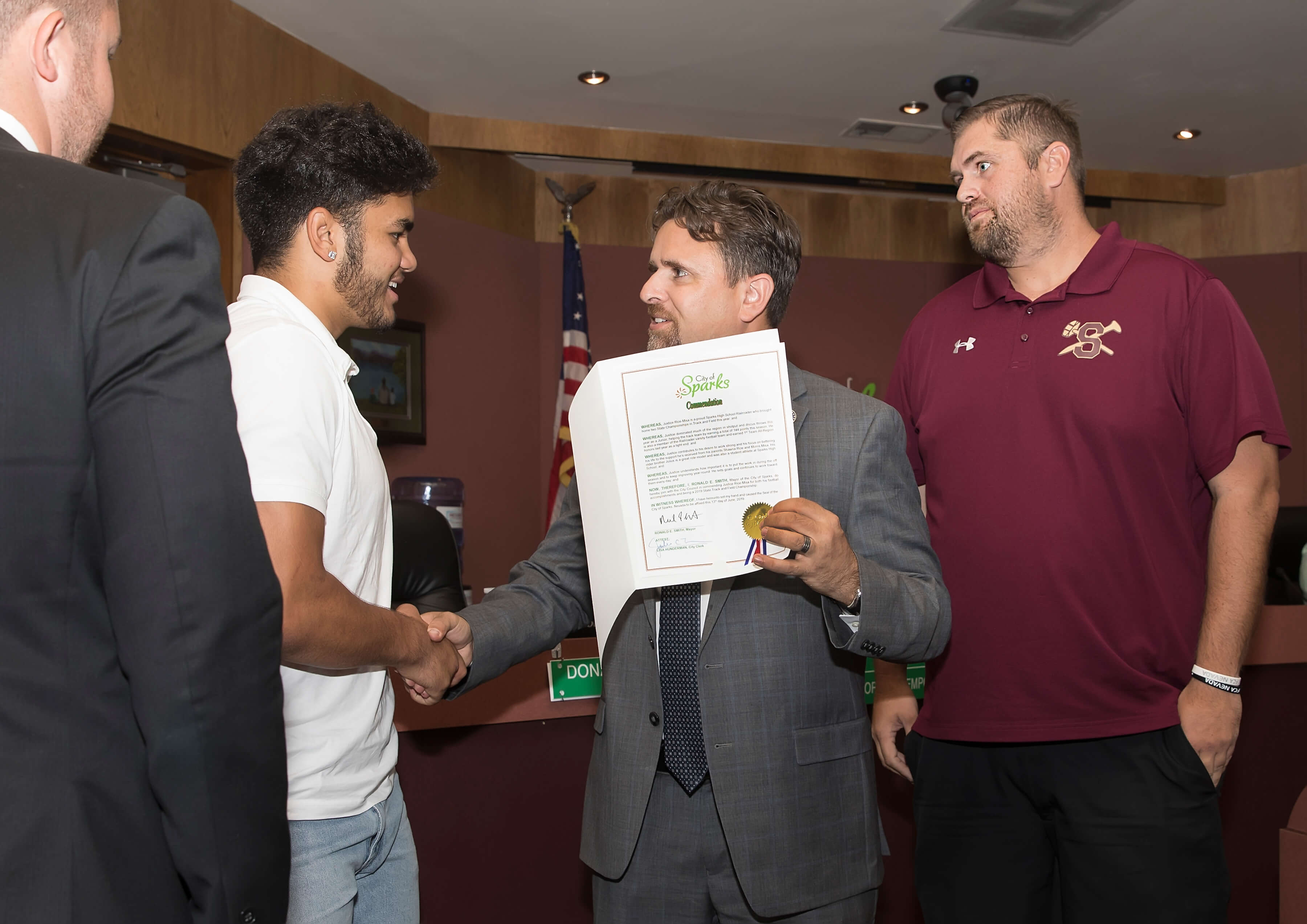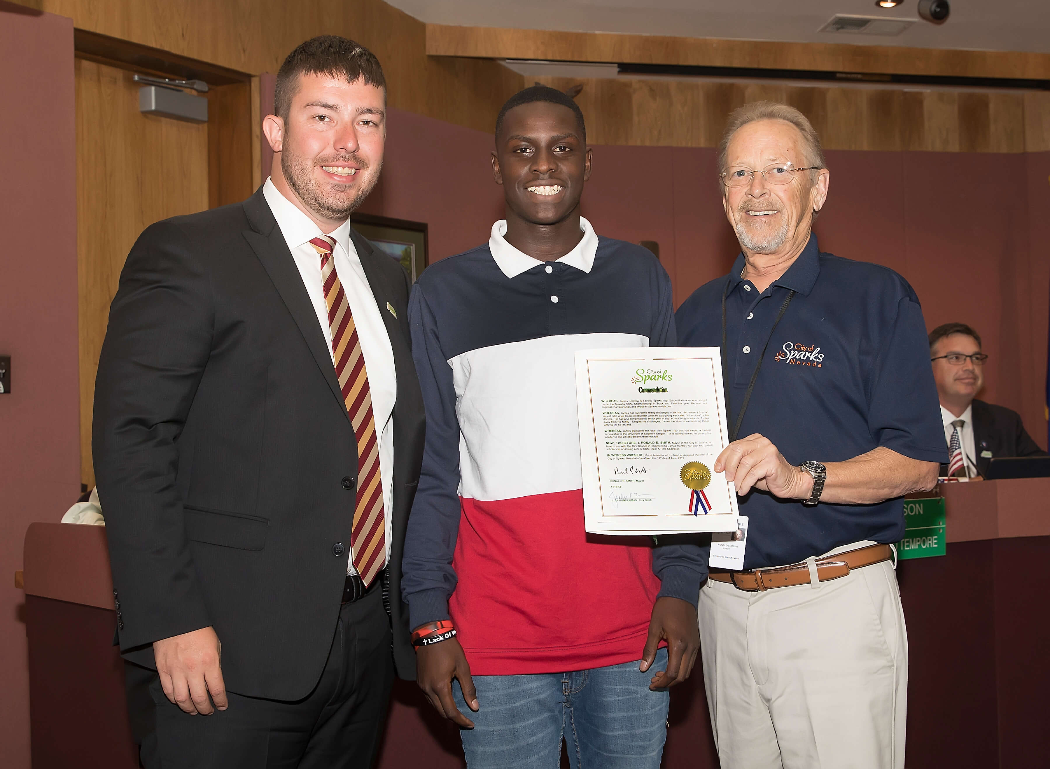 Sparks City Council honored two athletes and a longtime business owner at Monday’s meeting. Sparks High School’s James Renfrow (first image) and Justice Mesa (second image) were recognized for their football accomplishments and track and field achievements during the 2018-19 school year. Renfrow was also commended for earning a football scholarship to the University of Southern Oregon. Kristine Maioli (third image) and Sinbad’s Hot Dogs were honored as well Monday for their 40th Anniversary in Sparks.