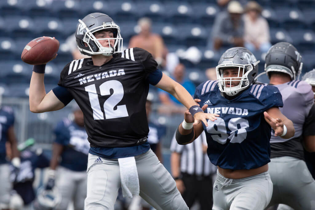 Nevada redshirt freshman Carson Strong drops back to throw during the team’s first scrimmage Saturday at Mackay Stadium. Strong has taken the majority of reps at quarterback in practice since the Wolf Pack lost Cristian Solano to a hand injury, and threw for three touchdowns and zero interceptions on Saturday. The Pack has one more scrimmage on Friday before preparing for its season-opener against Purdue on Aug. 30.