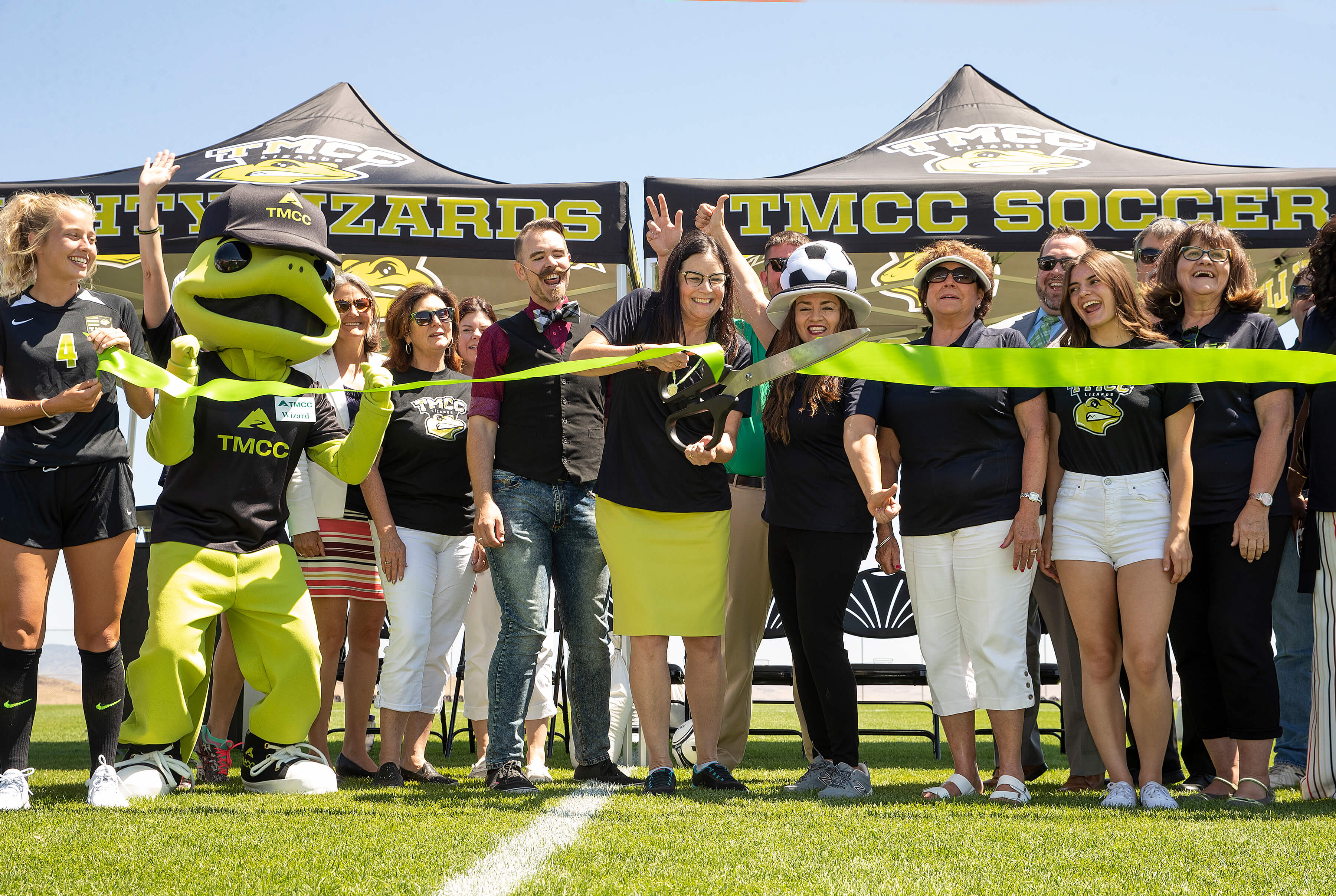 TMCC President Karin Hilgersom cuts a ribbon alongside local RenoSparks officials for the school’s new soccer complex Saturday. The Lizards are a member of the National Junior College Athletics Association and are competing in the Scenic West Athletic Conference. Both the men’s and women’s teams played games at the new field after the ceremony.