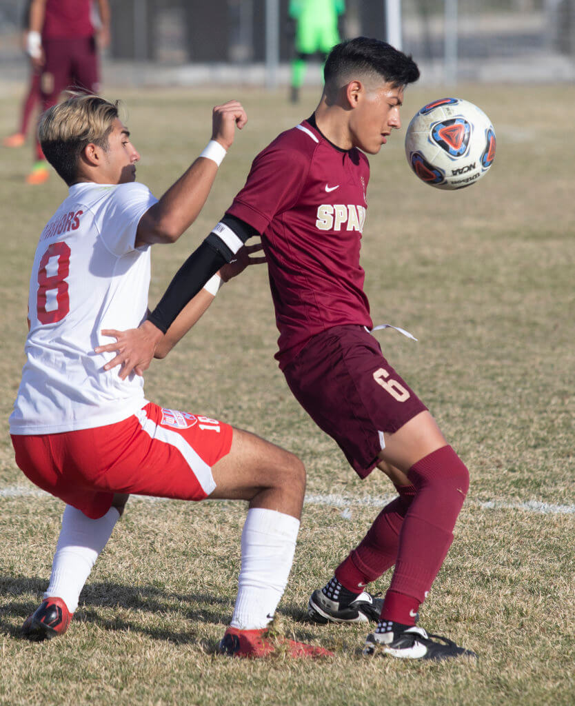 Sparks’ Omar Hernandez battles with a Western player for the ball during Saturday’s 3A boys state title soccer game at Wooster. The Warriors went on to defeat Sparks 2-1 to win the state championship, handing them their first loss of the season. The Railroaders had got into the title game after a 2-0 win over Equipo Academy in the state semifinals. They finished the season with an overal record of 25-1-1.