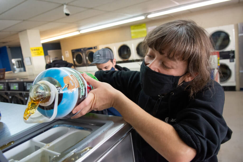 The sharp scent of cleaning products wafts through the laundromat as three volunteers help load washing machines with coats, blankets and other items, checking in with people about what temperature the water should be for different loads and asking about housing situations or supportive services.