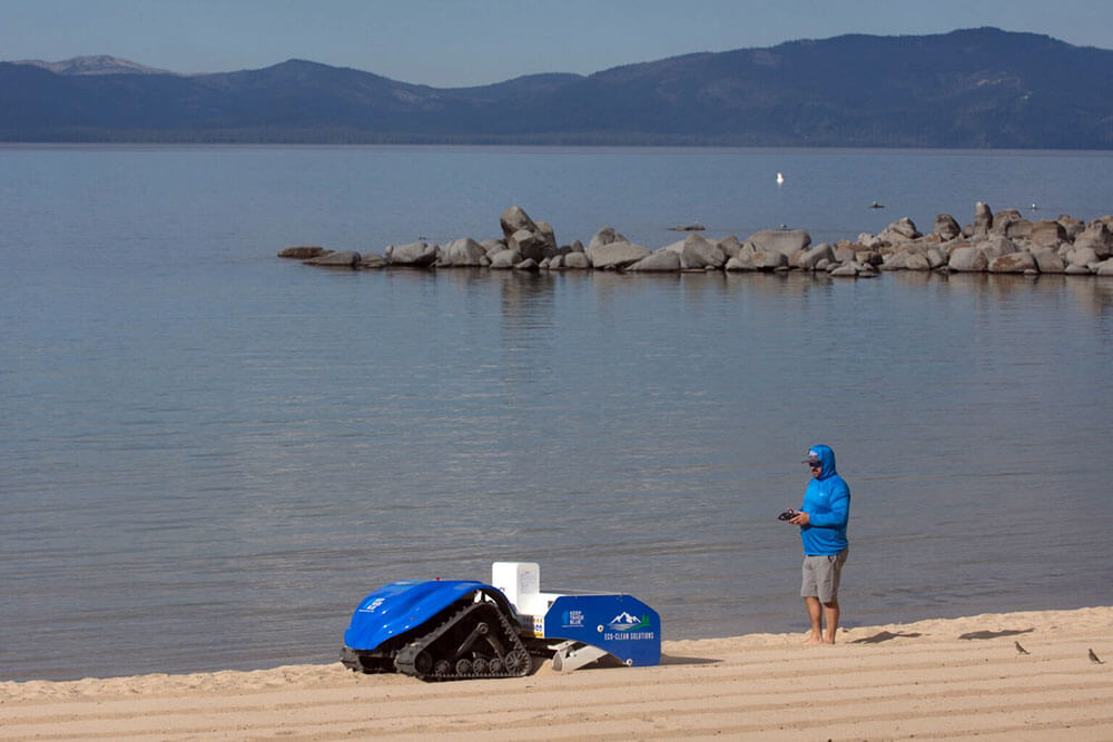 Last year, the League to Save Lake Tahoe partnered with ECO-CLEAN Solutions, a company that touts itself as providing “eco-friendly, noninvasive cleaning technologies for beach, coastal and marina environments,” to pilot the BEBOT, an electric and solar-powered sand-sifter to remove difficult-to-detect, hard-to-remove trash.
