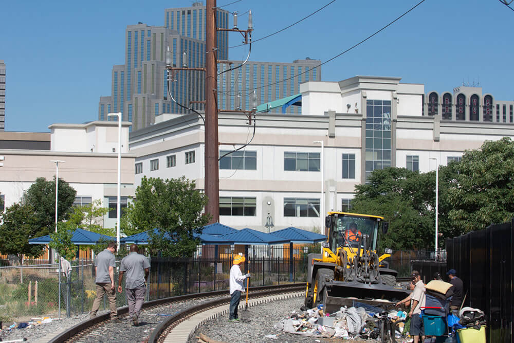 The city of Reno’s Clean and Safe Field Team clean up a trash pile during a sweep of a camp along the train tracks between Record Street and the Wells Avenue overpass in Reno on July 18, 2023.