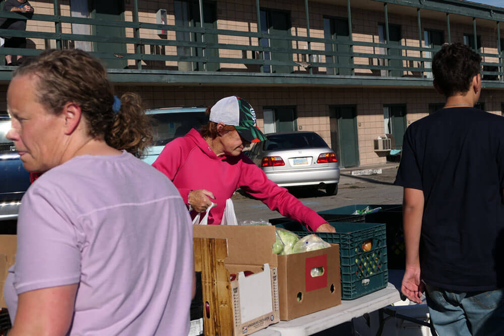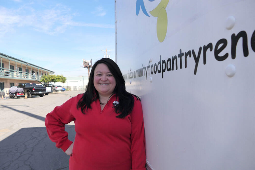 At 8 a.m. on a sunny, mid-October Saturday, volunteers for The Community Food Pantry mobile program gather outside the Ponderosa Hotel — a motel in the heart of Reno used by some people as their permanent residence — and start giving out food.